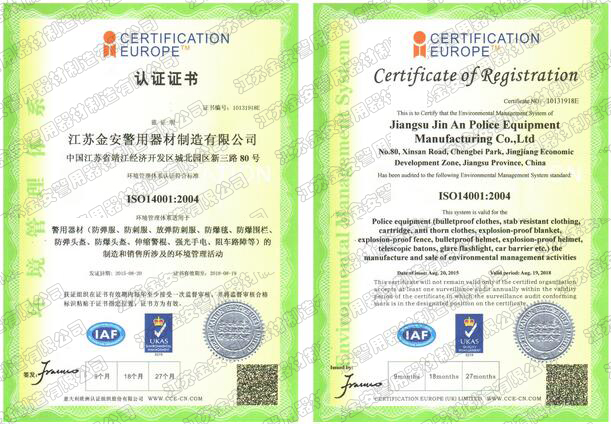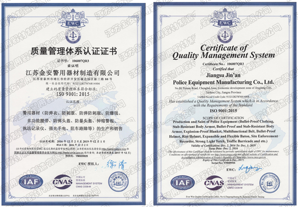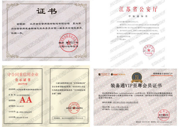 第一批新型單警裝備定點(diǎn)生產(chǎn)企業(yè) 公安部警用裝備采購中心協(xié)議供貨單位 公安部防彈防刺服生產(chǎn)定點(diǎn)企業(yè) 江蘇省公安廳防彈衣入圍企業(yè) 江蘇警用裝備行業(yè)協(xié)會(huì)會(huì)員單位 中國刑事科學(xué)技術(shù)協(xié)會(huì)團(tuán)隊(duì)會(huì)員單位 中國安全防范產(chǎn)品行業(yè)協(xié)會(huì)會(huì)員單位 靖江市保安器材行業(yè)協(xié)會(huì)常務(wù)理事單位 全國警用裝備標(biāo)準(zhǔn)化技術(shù)委員會(huì)通訊委員 江蘇金安警用器材制造有限公司始創(chuàng)于九十年代初,公安部防彈防刺服生產(chǎn)定點(diǎn)企業(yè)、公安部警用裝備采購中心2..